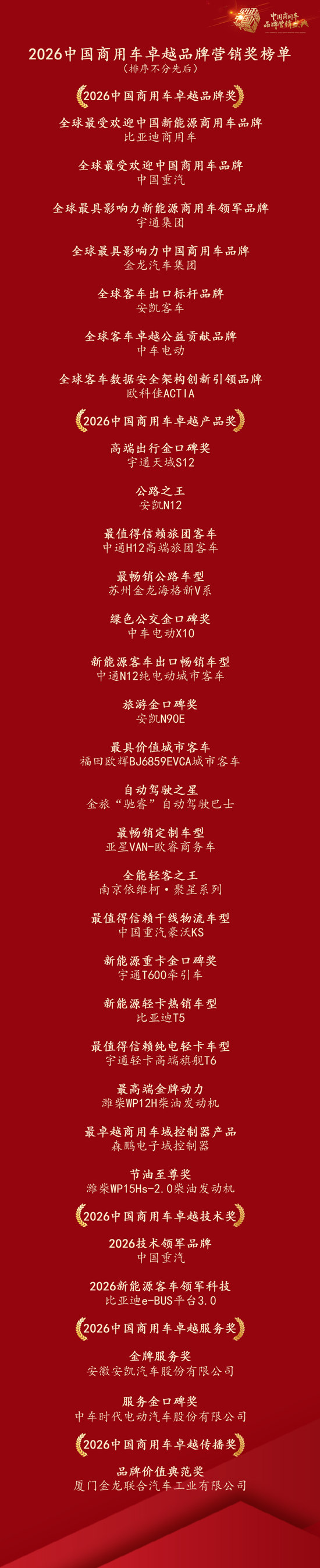 作为盛典最受瞩目的核心环节,现场重磅揭晓了涵盖品牌、产品、技术、服务及传播五大领域的30项荣誉榜单。这些奖项以先锋力量生动诠释了行业向上的蓬勃生机,为商用车行业的转型升级提供了鲜活的实践样本。